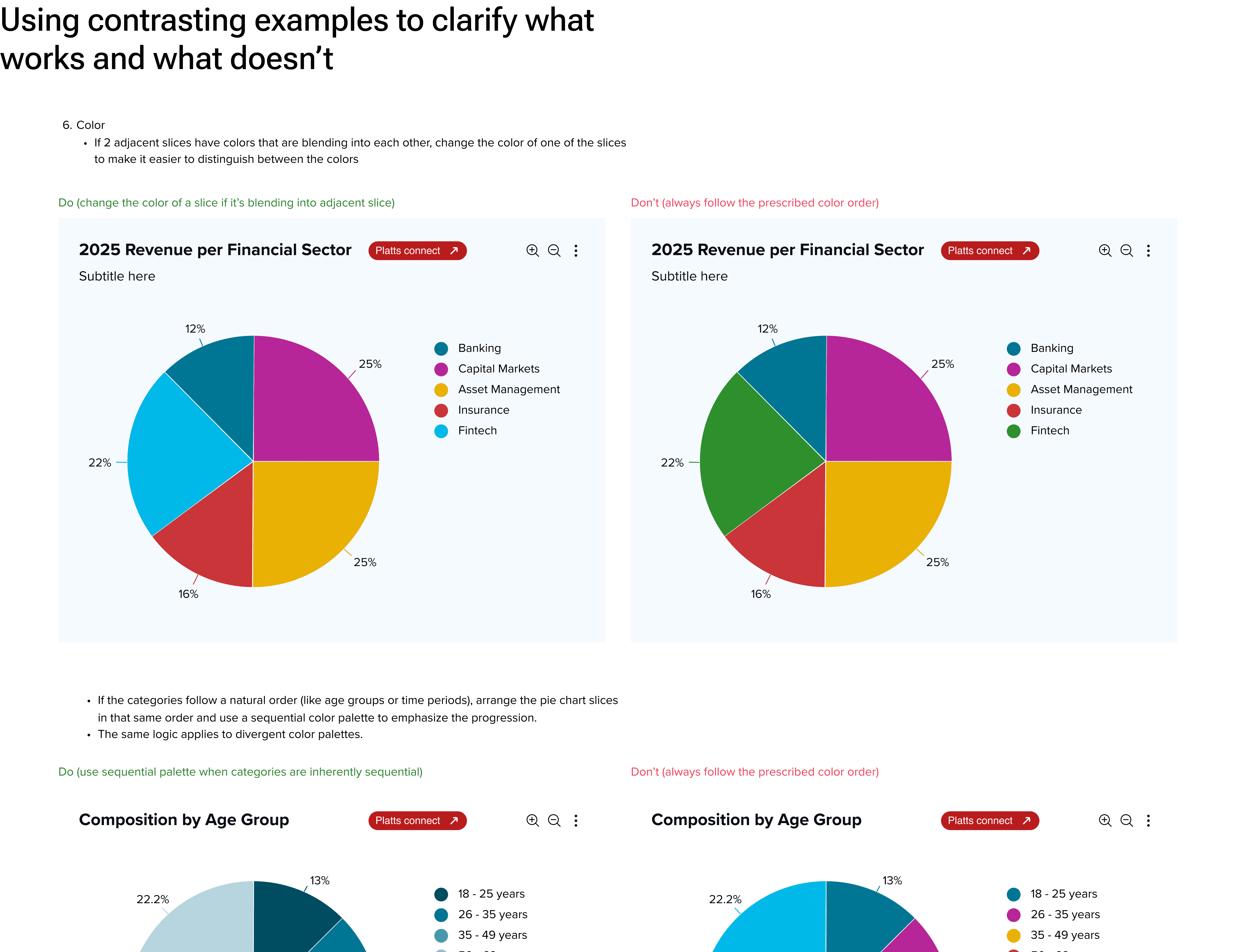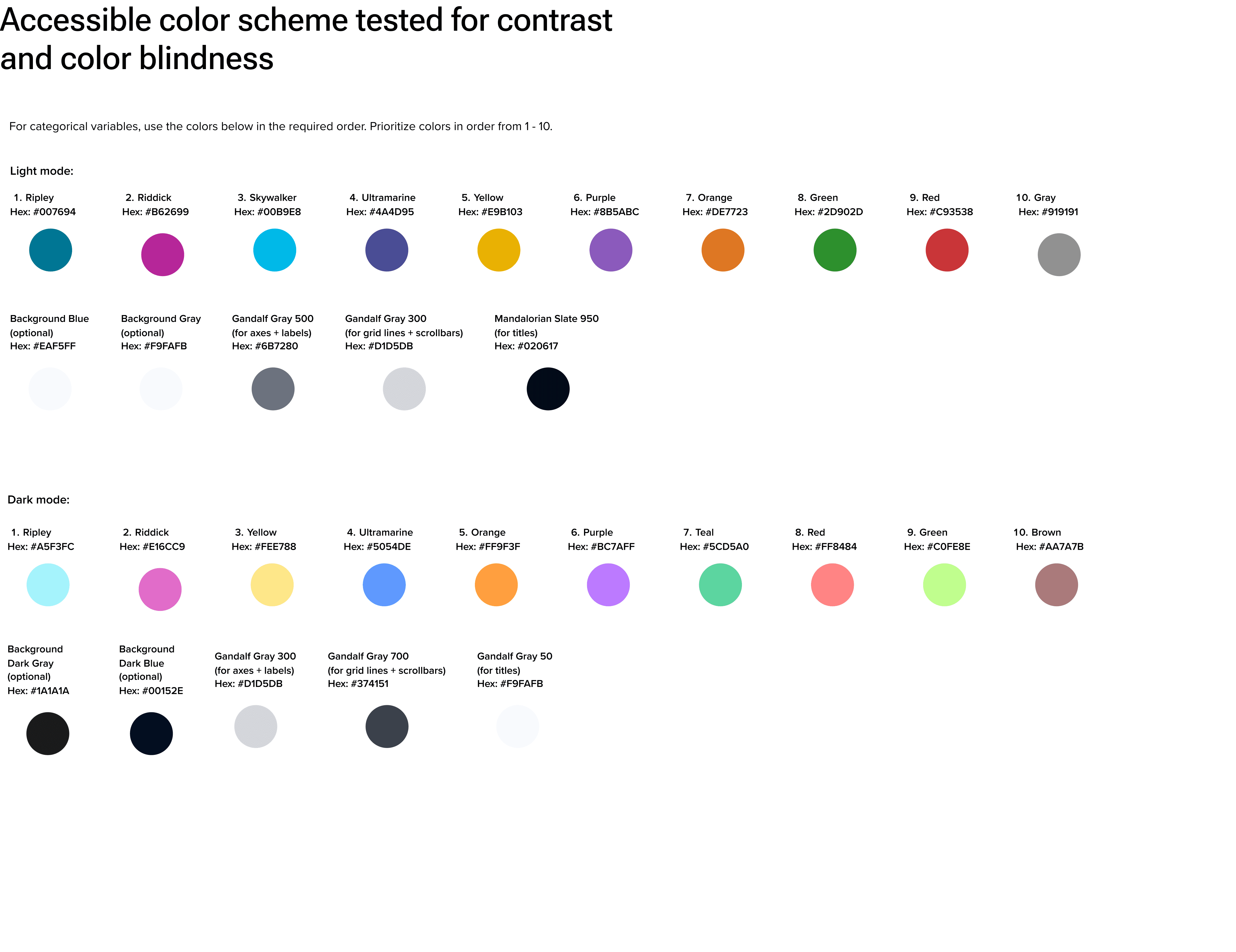 He said I was off to a great start but needed more flexibility — guidelines should be framed as suggestions. Since not all designers/engineers know data viz, he advised adding explanations for chart elements.