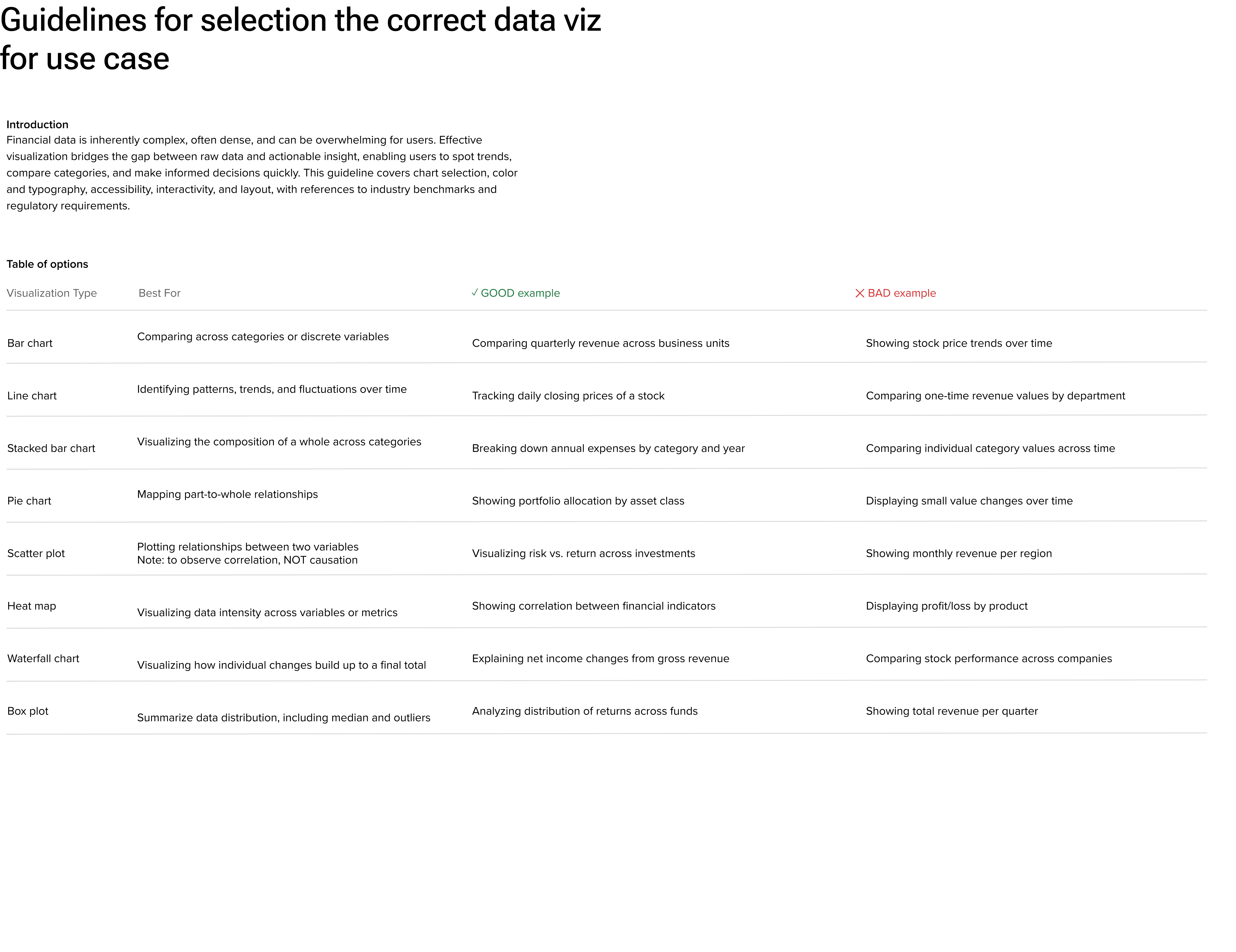 I studied leading design systems and realized the best ones were intentional. To bring that same clarity, I researched and narrowed ours to 8 essential chart types.